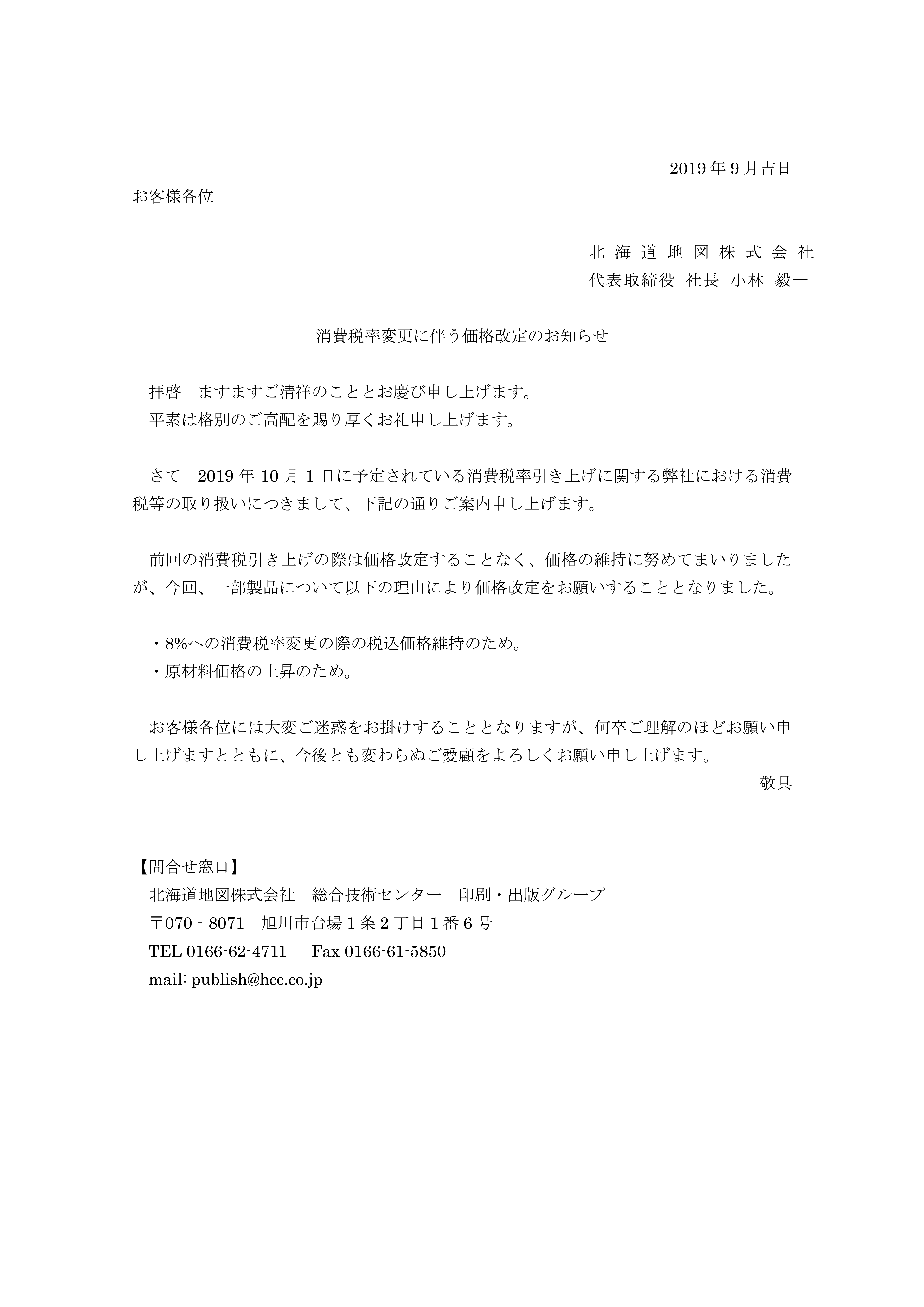 2019年10月1日に予定されている消費税率引き上げに関する弊社における消費税等の取り扱いにつきまして、下記の通りご案内申し上げます。