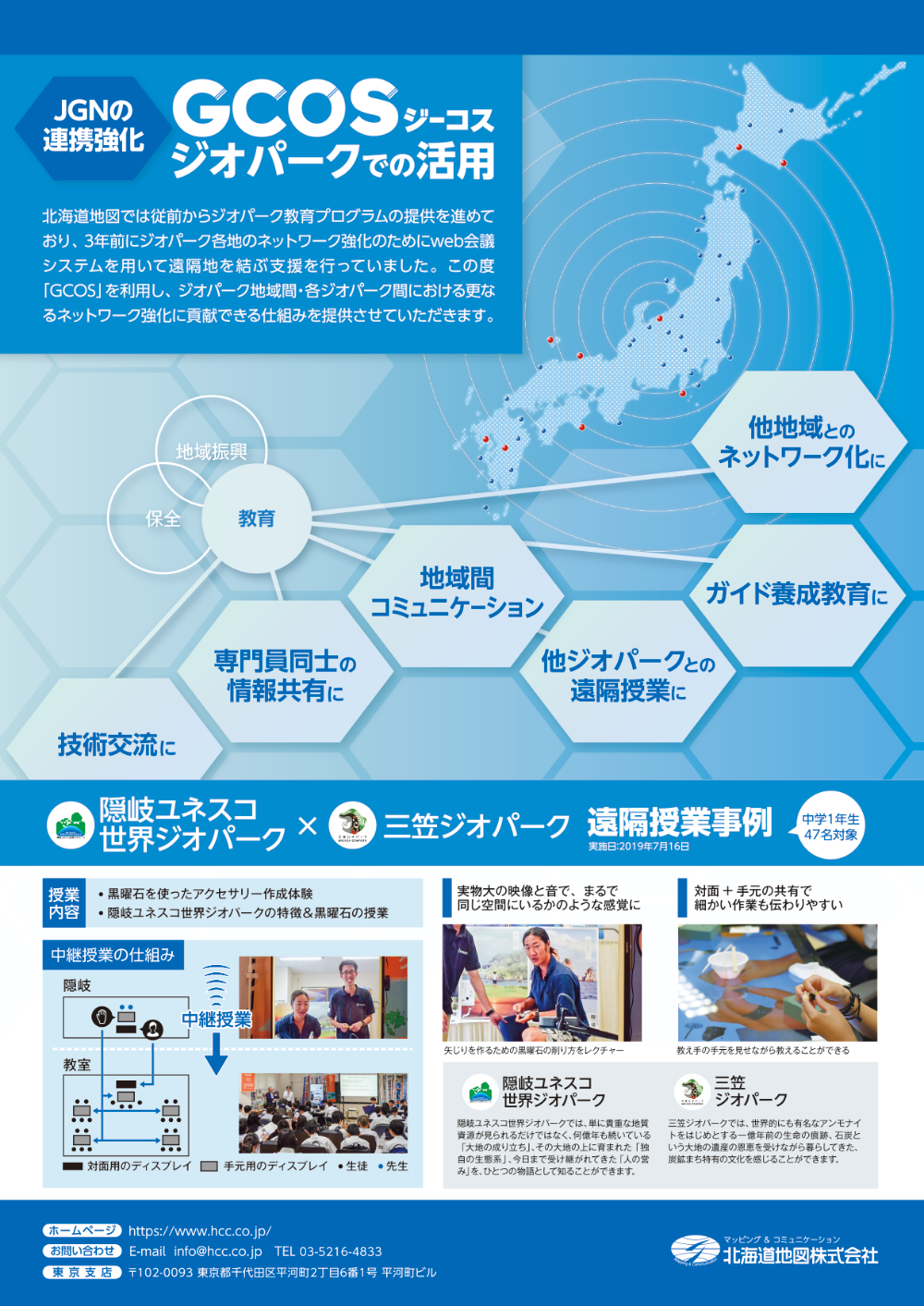 なお、今年7月には隠岐ユネスコ世界ジオパークに協力・ご指導をいただき北海道地図株式会社にて三笠ジオパークが実施する教育プログラムの研修旅行を(三笠中学校生徒を5年間継続授業)同システムを用いて、隠岐GPの専門員からジオパークの特徴の受ける授業を実施しました。