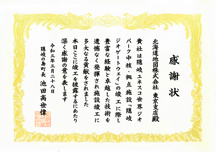 このたび、弊社が展示設計・制作・施工を担った「隠岐自然館」(島根県隠岐の島町)の新築移転にあたり、隠岐の島町の池田高世偉町長から感謝状をいただきました。