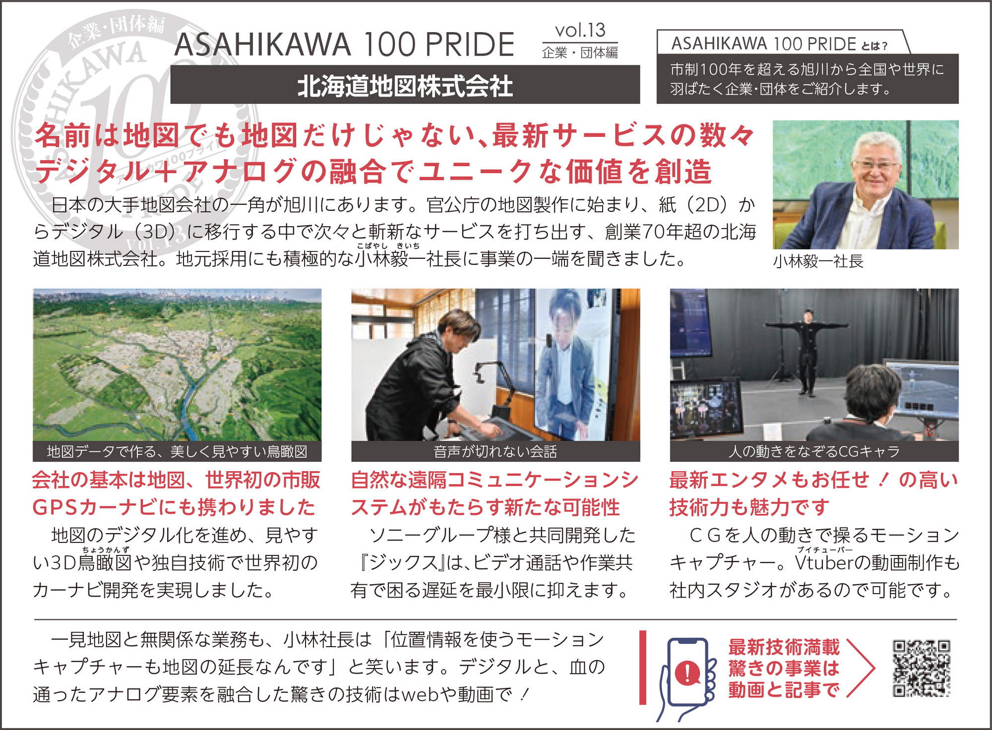 北海道旭川市の広報誌「あさひばし」6月号にて弊社代表 小林が取材を受け、旭川市の企業や団体・逸品を紹介する特集「ASAHIKAWA 100 PRIDE」にて、北海道地図株式会社の歴史とあゆみ、地図印刷、モーションキャプチャ―、ソニーグループと共同開発した「GICS」などのアナログとデジタルを融合させた事業紹介、今後の事業展開などについての記事を掲載いただきました。