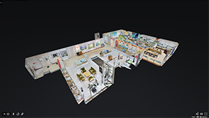 マーターポートは撮影と3Dスキャンを同時に行っているのが特徴です。この技術により施設の内観全体を俯瞰(ドールハウスビュー)で表示することができ、さまざまな角度から施設の立体的な空間イメージや特徴を掴むことができます。