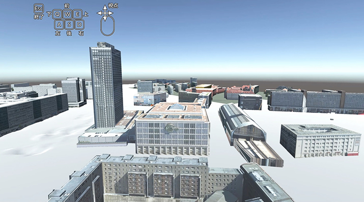公開 されているCityGMLと地形データを使用して再現しました。