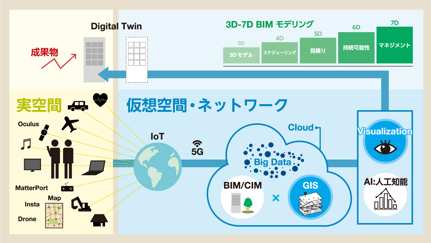 IoT(モノのインターネット)を利用し収集するリアルタイムの情報が、5Gにより円滑にクラウドに収集され、ビッグデータ化した情報と仮想空間地図との融合により様々なシミュレーションができるソリューションが、弊社の目指すデジタルツインの姿です。