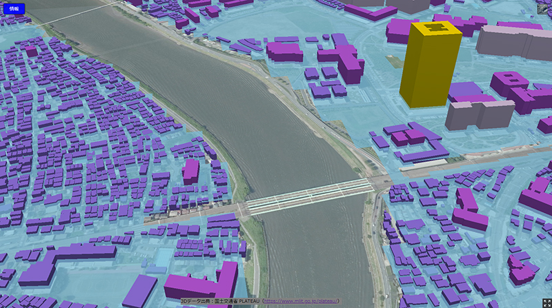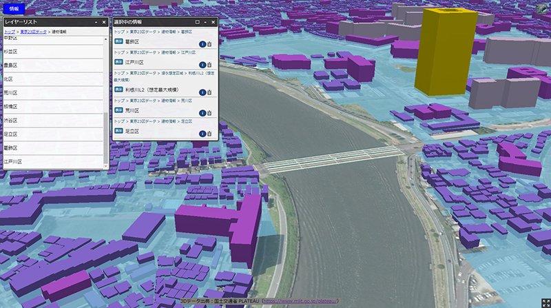 「情報」→「建物情報(東京23区)」→「区名」で建物モデルを、