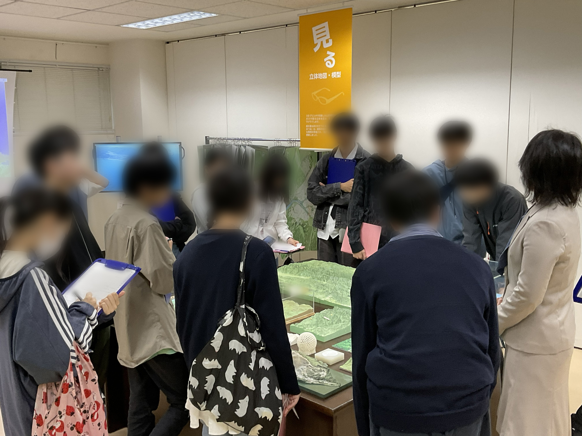 弊社の歴史や地図製作物の説明では、立体模型などに大変興味を示していて、とても熱心にご覧になっていました。