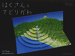 白山から手取川へ雪解け水が流れこむ様子を、「飛び出す絵本」風のオブジェに仕立てました。