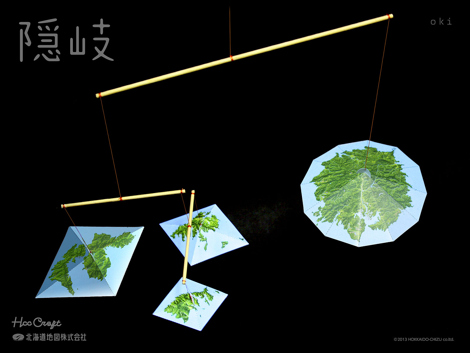 島根県の沖合に広がる隠岐ジオパークを、実際の位置関係が再現できるモビールに仕立てました。